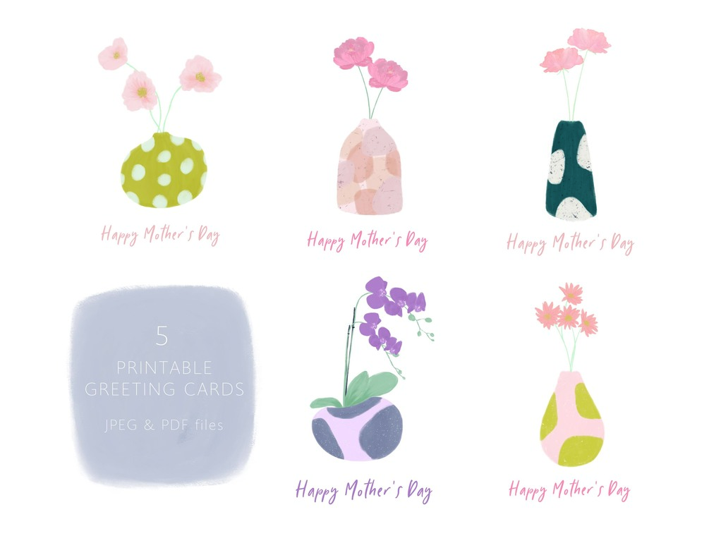 5 ready to print Mother's Day Cards in JPEG & PDF files.